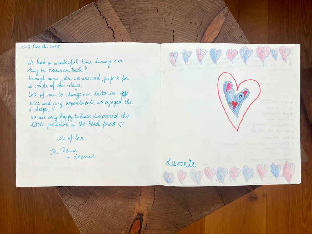 Wir haben den Urlaub in der Wohnung im Haus am Bach sehr genossen. Es hat uns eine liebevoll eingerichtete Wohnung, nette Vermieter und eine tolle Umgebung erwartet. Wandern und Ski laufen macht dort viel Spaß. Die hübsche Stadt Freiburg ist nicht weit entfernt. Wir kommen wieder!